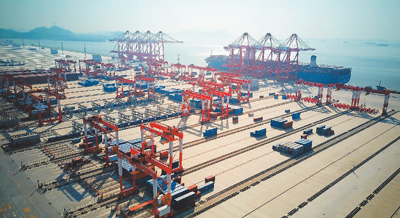 圖為上海洋山港四期碼頭。該碼頭實現了碼頭裝卸、水準運輸、堆場裝卸環節的全過程智慧化,成為全球規模最大,設備最先進的集裝箱全自動化碼頭之一,將進一步促進中國外貿進出口。許叢軍攝(人民視覺)