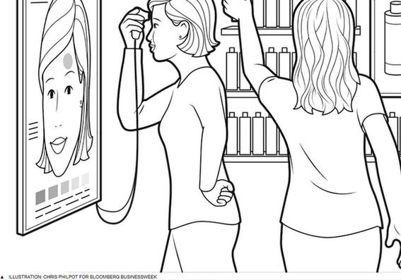 “魔鏡”讓顧客可以虛擬化粧,嘗試不同色調的唇膏或眼影。圖片來源:彭博社網站報道截圖