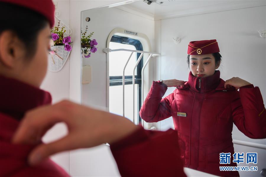 1月31日,杜瑤在Z267次列車上整理著裝,準備迎接旅客上車。 杜瑤是中鐵呼和浩特局集團有限公司Z267次列車的列車員,1月31日,她要出乘前往上海,直到大年初一才休假。陳玉強是中鐵呼和浩特局集團有限公司Z338次列車的列車長,大年三十的晚上,他要到包頭接車出乘前往南寧。 今年1月份,兩人剛領證結婚。因為婚後第一個春節沒法在一起度過,陳玉強準備了熱飯和新婚禮物,在站臺上探望工作中的杜瑤。這一次站臺分別之後,下一次他們團聚將是在正月十五元宵節。 新華社記者 劉磊 攝