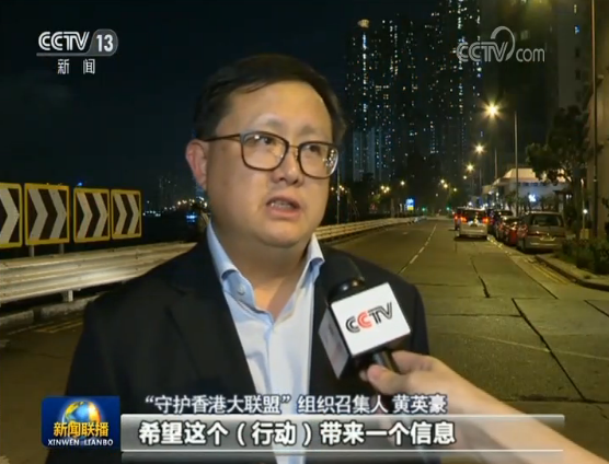 “守護香港大聯盟”組織召集人黃英豪:希望這個(行動)帶來一個信息,就是香港同胞我們是14億中國人民的一部分,我們是非常熱愛祖國、同時也是歡迎內地同胞來香港。