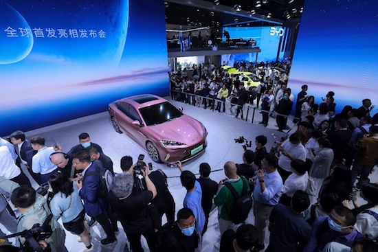 4月18日,比亞迪海洋網首款B+級超混轎車驅逐艦07在上海車展正式首發亮相。驅逐艦07採用海洋美學設計理念,擁有越級大空間,搭載DM-i超級混動技術,價格區間為20萬-25萬元,新車將於今年三季度正式上市,是本屆上海車展最受關注的插混轎車。