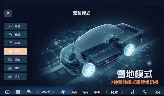 雷達地平線搭載高性能永磁同步雙電驅系統,峰值總功率可達315kW,峰值扭矩594Nm,0-100km/h加速時間為4秒左右。該車擁有7種駕駛模式,可滿足各種路況駕駛需求,還可語音切換;車輛還搭載智慧全地形反饋系統,可智慧調節四輪扭矩分配。