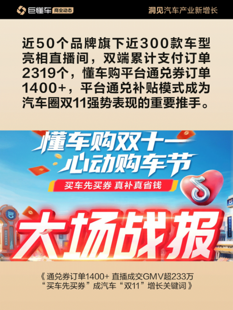 當傳統電商平臺為“雙11”增長乏力而困擾時,汽車圈的“雙11”卻呈現出截然不同的景象。11月5日,懂車購“雙11心動購車節”直播正式開啟。在11月5日至7日的三天時間內,近50個品牌旗下近300款車型亮相直播間,懂車帝和抖音雙端累計支付訂單2319個,成交GMV233.2萬。懂車購平臺通兌券三天訂單1400+,平臺通兌補貼模式成為汽車圈“雙11”強勢表現的重要推手,也讓汽車交易線上化迎來全新的發展階段。