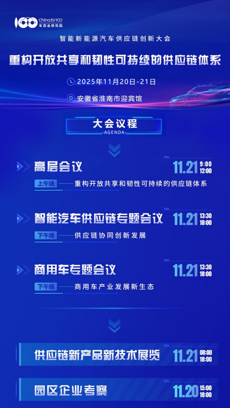 11月20日,大會將組織一場園區企業考察活動,屆時嘉賓將深入淮南高新區,實地參觀園區空間沙盤、了解産業政策與配套體系,並前往重點企業調研,感受淮南汽車産業鏈的創新實踐與發展潛力。同時,大會期間還將舉辦供應鏈新産品新技術展覽活動,集中呈現供應鏈創新成果與最新應用。(資料來源:車百會)