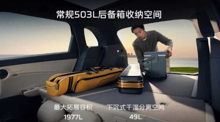 內飾典雅科技,中控及副駕雙聯屏可以提供豐富的顯示及娛樂內容。該車搭載靈犀座艙,採用高通8295P晶片,可流暢支持四平聯動不卡頓,並完美支持蘋果carplay、華為Hicar等互聯繫統。三幅式方向盤採用雙色搭配,前方的液晶儀錶盤尺寸適中,顯示信息豐富,該車還搭載有30寸的AR-HUD顯示屏,駕駛信息獲取更加輕鬆便捷。內飾提供有四種內飾顏色,分別為墨石黑、芳華紅、秋實橙和林雪白。該車擁有31處儲物空間,後備廂標準容積503L,最大可拓展至1977L,在後備廂下部,還有49L乾濕分離的儲物空間。