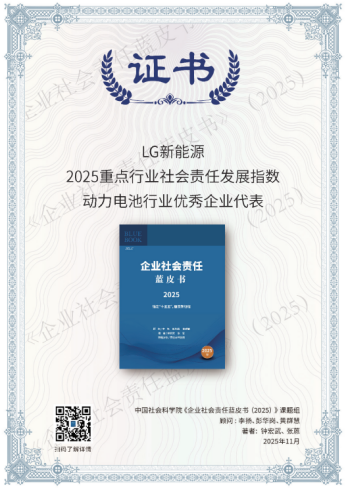 11月20日-21日,由中國企業改革與發展研究會主辦的第八屆北京責任展在京舉辦併發布了《企業社會責任藍皮書(2025)》。憑藉推動綠色低碳發展、構建可持續未來方面的傑出貢獻,LG新能源再創佳績,不僅連續五年穩居“動力電池行業社會責任發展指數(2025)”首席,並首次進入“外資企業100強社會責任發展指數(2025)”十強。同期,在峰會上,LG新能源發佈的《LG新能源(中國)2025環境、社會及管治(ESG)報告》(以下簡稱ESG報告),經中國企業社會責任報告評級專家委員會評級小組綜合評價保持五星水準。