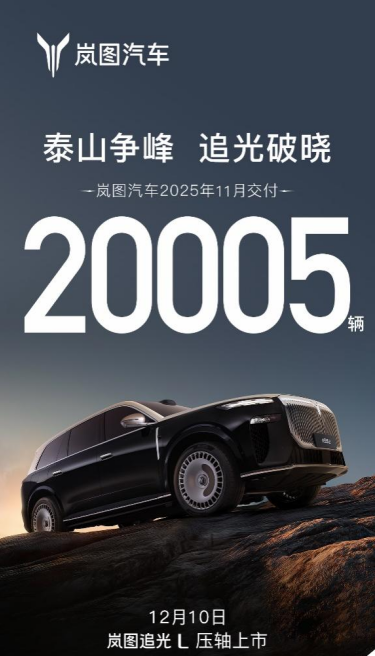 嵐圖汽車董事長、總經理盧放表示,“得益於廣大用戶的支持和信賴,嵐圖汽車11月交付量持續攀升,並成為國內首個達成30萬輛的央國企高端新能源品牌,在新能源賽道上跑出‘嵐圖速度’。高端産品矩陣煥新升級,三旗艦重磅登場。嵐圖泰山上市後訂單持續火爆,爭鋒豪華大六座SUV市場,嵐圖夢想家山河引領四座旗艦MPV進入智慧豪華的全新時代,12月10日正式上市的嵐圖追光L將對豪華轎車市場發起衝擊。嵐圖汽車始終堅持以用戶需求為導向,打造央國企轉型新標杆,彰顯中國高端新能源品牌持續向上攀登的自信和實力。”