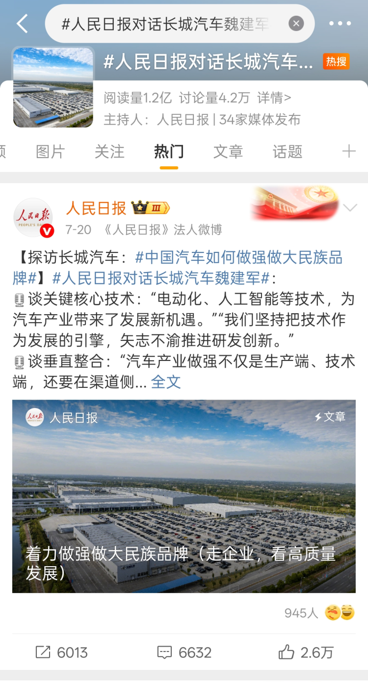 回顧2025年,長城汽車多次登上《人民日報》,從7月頭版對其自主研發創新的專題報道《長城汽車堅持自主研發創新——著力做強做大民族品牌》,到8月國際版點讚長城汽車巴西工廠竣工投産的“中巴合作新典範”,再到11月中國工程院院士在評論版撰文肯定Hi4技術的突破性貢獻。12月29日,長城汽車董事長魏建軍的署名文章也登上《人民日報》評論版,系統性闡述了“文化引擎”驅動汽車産業高品質發展的理念。
