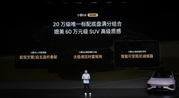小鵬G6底盤立足用戶需求持續進化,從最初專注單人運動操控,全面升級為滿足一家人的駕乘舒適。此次,小鵬G6超級增程全係標配太極AI底盤,同級唯一標配前雙叉臂/後五連桿獨立懸架+太極液壓襯套矩陣+智慧可變阻尼減振器,以20萬級唯一標配底盤滿分組合,擁有媲美60萬級SUV的高級質感,讓每位駕乘者都能擁有良好的體驗。新車還擁有行業領先的5項AI底盤能力,擁有感知廣、執行快、可迭代的優勢,可實現最遠提前200m識別、最大提前300ms調節,並具備超強自學習能力,最快21天可迭代一個新功能,輕鬆應對城市、鄉村、高速等多種路況,適配家庭全場景的駕乘需求。