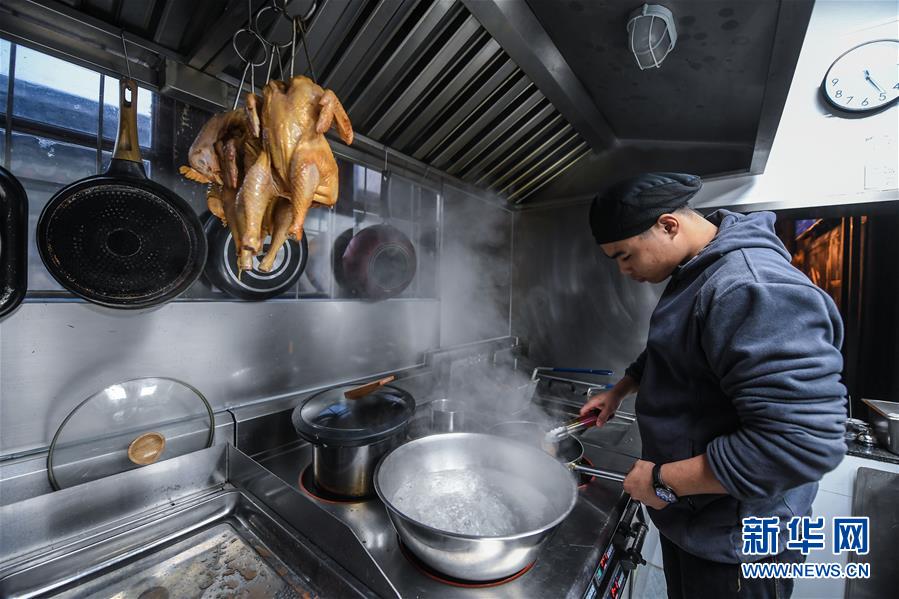 小西街歷史文化街區內一家餐廳的廚師在全電廚房內烹飪菜肴,該廚房已經不使用傳統明火(11月28日攝)。 新華社記者 徐昱 攝