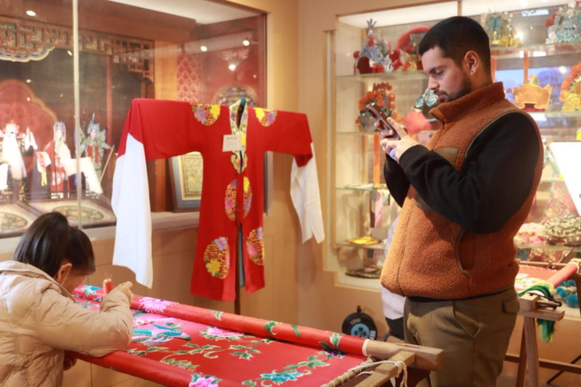 體驗環節,網紅博主們或拿起針線嘗試京繡基礎針法,或穿戴輕量化的京劇盔頭、戲服拍照打卡。老撾時尚博主體驗後驚嘆,“今天的戲服體驗太驚艷了!”這些戲服精美考究,上面的刺繡更是精巧。特別是服裝上栩栩如生的龍紋,作為極具代表性的中國符號,盡顯東方韻味。他還表示,老撾也有不少戲服愛好者,他希望能將這種“前店後廠”的模式引進老撾,“畢竟文化無國界,好的文化值得跨越山海傳遞”。
