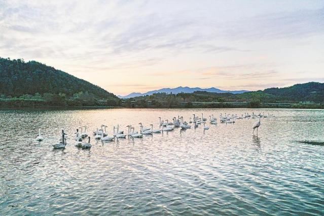 近日,在南平市建陽區將口鎮山尾路與濱江西路交接的武夷山國家公園一號風景道旁,一群小天鵝在水清岸綠的崇陽溪上棲息嬉戲。