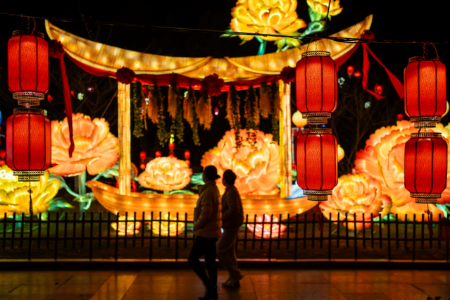 穿過“錦繡芳華門”,仿佛推開通往古典園林的月光之門。“牡丹”在夜色裏舒展花瓣,光影流動間,人已入畫。市民穿行其間,衣袂拂過燈影,恍若走進戲中世界。