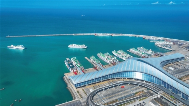 1月27日,海口新海港碼頭客滾船有序進出港,一派繁忙景象。
