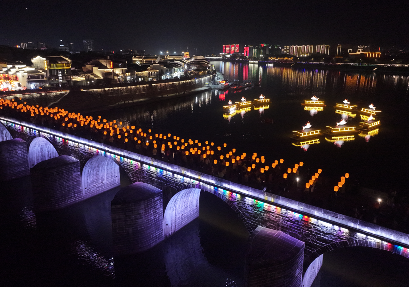 江上,遊船緩緩行駛,載著滿城燈火與人間暖意,勾勒出獨屬於屯溪的詩意與繁華。橋上,鎮海橋孔明燈祈福儀式溫暖啟幕,市民遊客紛紛寫下新年心願,解鎖“雲端寄福”的儀式感。岸邊,猜燈謎、抽大獎、篝火歡舞輪番上演,讓新春的喜樂直達心底。