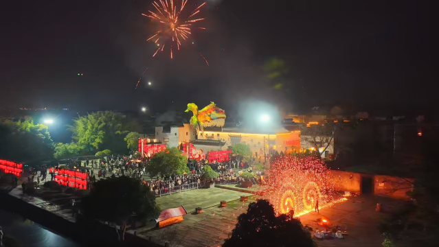 活動現場人氣爆棚、年味十足,紅燈籠高挂古巷,綵燈點亮青瓦,整個古村沉浸在喜慶祥和的節日氛圍中。景區特別引入亞運會同款“鰲魚飛天”,靈動的造型、恢宏的氣勢,一亮相便成為遊客爭相打卡的“流量密碼”。來自天津的胡曉帶著父母首次體驗徽州年俗,燦爛的打鐵花、婉轉的黃梅戲,讓全家直呼過癮:“太熱鬧了!太有年味啦!尤其是‘鰲魚飛天’,寓意進取、祥瑞,既是新年氛圍的點睛之筆,更是我們對2026年最美好的期許!” 淩空遨遊、鱗光流轉的鰲魚,與地面上靈動舞動的魚燈相映成輝;抖火壺的烈焰、打鐵花的璀璨、夜空中綻放的煙花,層層遞進的視覺盛宴,吸引著一批批遊客奔赴這場“徽州新年之約”。