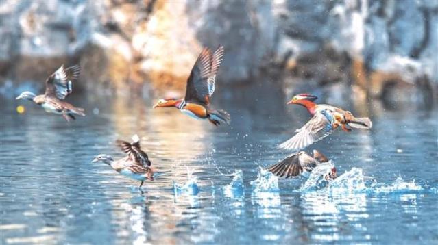 一群野生鴛鴦飛抵銅仁天生橋大峽谷國家濕地公園。 伍衛東 攝 (影像貴州)