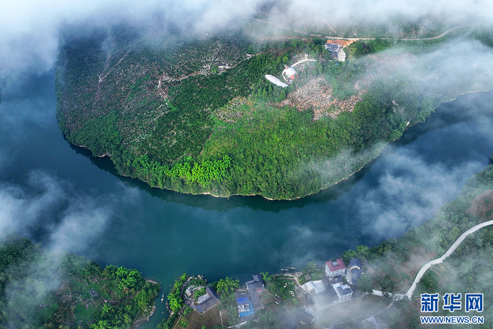 從高空俯瞰,青山綠水在晨霧籠罩下宛若一幅山水畫,展現出獨特的魅力。新華網發(陳碧生 攝)