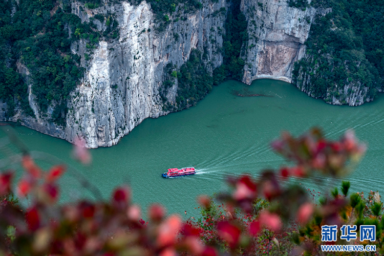 初冬時節,巫峽兩岸紅葉次第綻放。山水與紅葉相映,構成三峽獨有的秋冬盛景。新華網發(王正坤 攝)