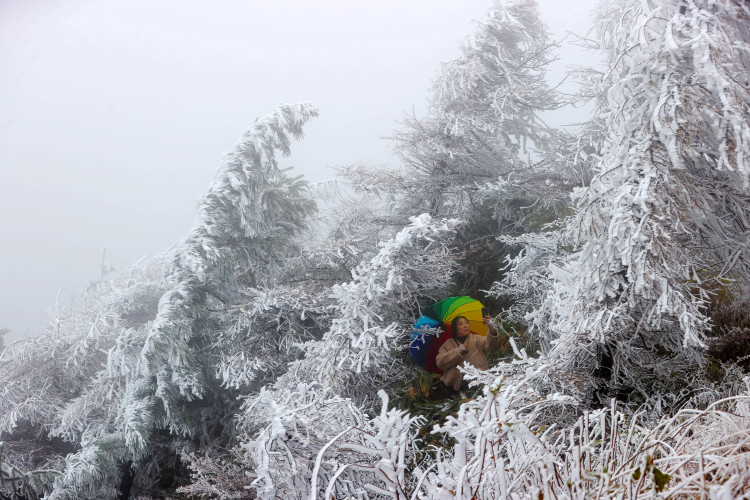 ▲11月18日,黔江區國家森林公園,遊客在灰千梁子景區賞雪。特約攝影 楊敏