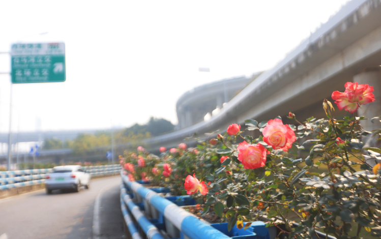 1月10日,沙濱路高家花園立交橋,車輛正在綻放的盆栽月季花道上行駛,亮麗的風景給人們帶來好心情。特約攝影 鐘志兵