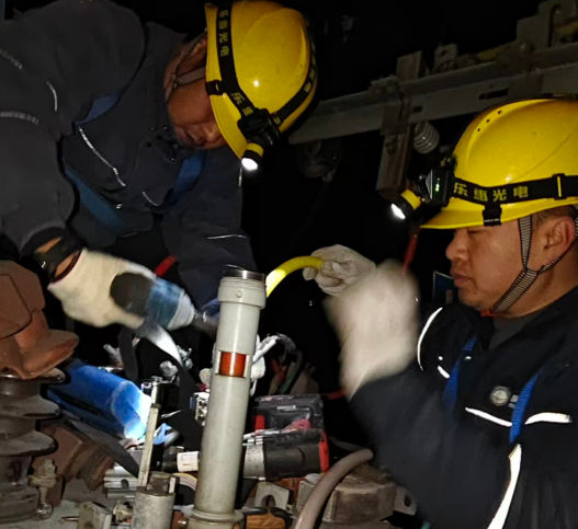 淩晨1點,作業人員備好器具,在探照燈下設置圍欄、挂接地線,有條不紊開展工作。剝皮、鋸斷、打磨、壓接……寒風中,4人輪流操作,認真完成每道工序。經試驗合格,三相新電纜頭準確接上變壓器低壓側樁頭。淩晨3時,設備恢復正常運行。
