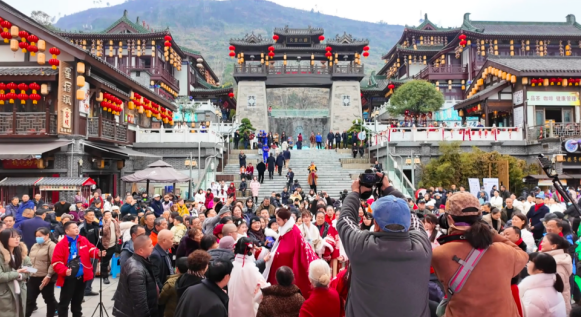 春節臨近,年味漸濃。1月31日上午,在重慶涪陵城區長江對岸,伴隨著陣陣鼓聲,涪陵爻裏小鎮·華夏易理文化涪州影視城煥新升級,吸引近萬名遊客在濃郁的傳統文化氛圍裏,看節目、品美食、參與互動,感受濃濃的年味。