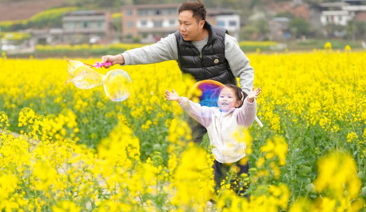 ▲2026年3月3日,墊江縣沙坪鎮畢橋村,遊客帶著小孩在花海裏吹泡泡玩耍。特約攝影 龔長浩