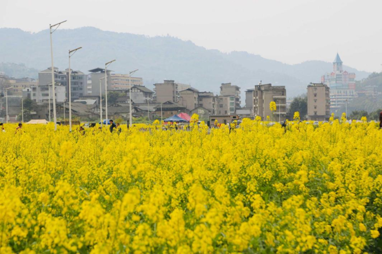 步入藺市古鎮通向江邊,連片油菜花層層疊疊、肆意盛放,金黃花浪隨風翻涌,清香四溢。古色古香的藺市古鎮街巷與歐式風情的紅酒小鎮建築遙相呼應,傳統煙火氣與現代浪漫感交融,讓遊客在賞花之餘,既能漫步青石板路感受古鎮底蘊,又能穿梭彩色城堡間體驗童話氛圍。