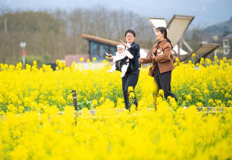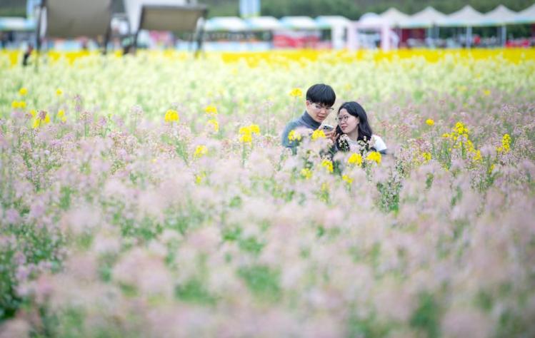 3月9日,遊客在油菜花田遊玩。新華社記者 唐奕 攝