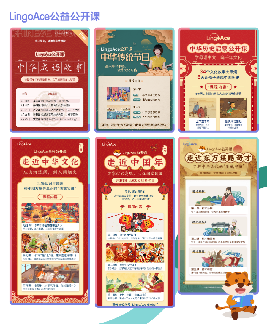 LingoAce公益公開課以弘揚中華文化、激發中文學習興趣為目標,精心打造豐富多元的主題內容,從海外孩子基礎的拼音學習到高階梯的寫作入門指導,從成語故事的字面解讀到深層次價值觀的解析,從中國國家地理知識普及到中華傳統文化學習,適合不同基礎,擁有不同學習目標與需求的學員,寓教于樂讓學生在有趣的知識和歷史故事中感悟中華文化,激發中文學習興趣。