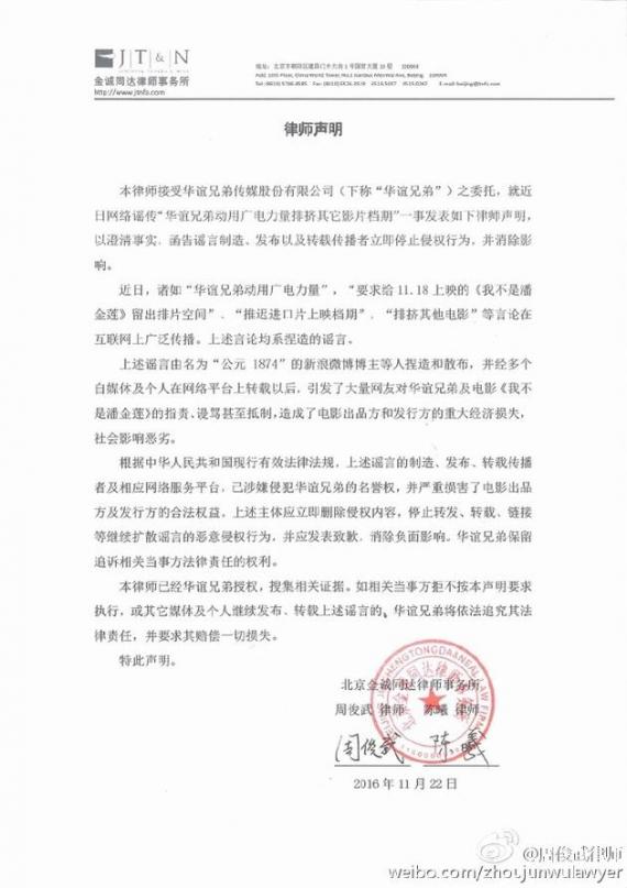 11月22日,華誼兄弟對近期網絡上流傳的“華誼為了給自家電影《我不是潘金蓮》留出排片空間,向廣電訴求,導致電影《神奇的動物在哪》改檔”等相關謠言,通過律師發表律師聲明,稱此言論均為造謠,將視情形受託採取相關後續法律措施。