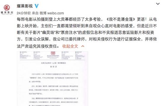 22日深夜,耀萊影視官微針對電影《我不是潘金蓮》的虛假信息和不實報道發表律師聲明,否認“幽靈場”和“票房注水”等傳言,耀萊影視表示:“每部電影從拍攝到登上大熒幕都經歷了太多考驗,《我不是潘金蓮》更甚!從電影上映開始,主創們一直都渴望傾聽到來自觀眾心底對電影的感受。
