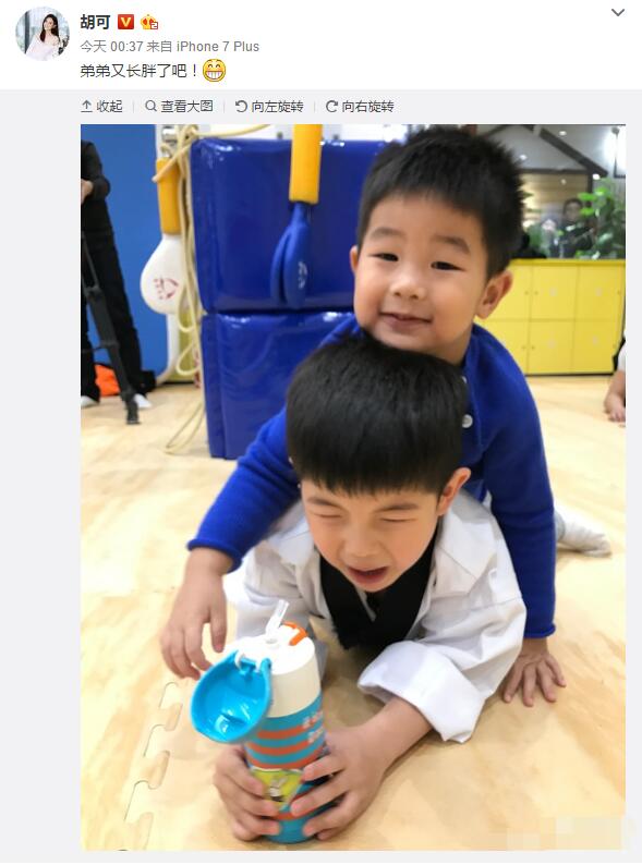 搜狐娛樂訊 2月14日,胡可在微博中曬出一張安吉與弟弟小魚兒的照片。照片中,小魚兒全身趴在哥哥身上,小臉肉嘟嘟笑得十分可愛,安吉穿著白襯衣手握水杯趴在地板上,臉上一副快要哭了的表情,難怪胡可在微博寫道“弟弟又長胖了吧!”