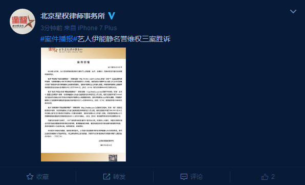 搜狐娛樂訊 “北京星權律師事務所官方微博”發佈了關於伊能靜名譽維權系列案件的律師聲明,稱“麻辣婊哥”、“娛老闆”、“雜文作家 王聖強”等相關行銷號,先後不斷通過微博發表了大量持續重復的嚴重侮辱、惡意誹謗的言論,伊能靜忍無可忍,于2015年6月25日在微博上發佈一封律師函,正式提起法律訴訟,堅決抵制網絡暴力和侮辱誹謗,今日勝訴大快人心。
