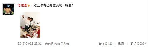 3月28日晚,李維嘉通過微博曬和何炅的自拍照,並稱:“這工作餐也是逆天啦!嗨森!”照片中,何炅站在維嘉身後雙手張開,兩人開心比著剪刀手,親密無間,兄弟友誼令人羨慕。桌上火鍋美食十分的豐盛。