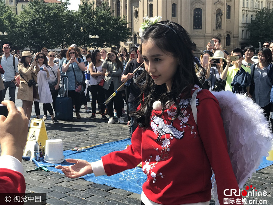 2017年5月16日,《奔跑吧》近日正在捷克錄製,Angelababy在布拉格街頭頭戴鮮花,穿著紅毛衣背著翅膀化身天使,甜美的造型與布拉格這座夢幻城市十分契合,少女感十足。視覺中國/視覺中國