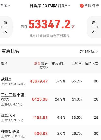 截止8月6日24時,《戰狼2》以單日4.37億的票房成績結束了自己第二周的吸金之旅,這一成績也打破了由《戰狼2》自己剛剛創造的3.98億元的華語電影單日票房紀錄。至此,《戰狼2》上映11天,累計砍下31.6億的票房,距離打破《美人魚》33.92億的中國影史票房紀錄只有一步之遙。