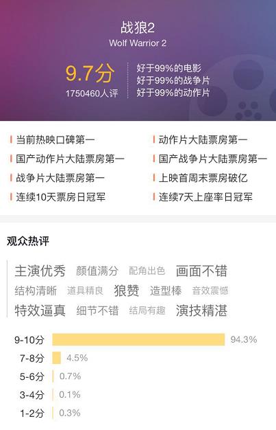 好電影不一定能大賣,但大賣的電影一定是觀眾眼中的“好電影”。這一點在之前在的《摔跤吧!爸爸》身上得到了充分的證明,貓眼9.8分創下了歷史記錄,12.99億的累計票房也成就了一段神話。 此番,《戰狼2》憑藉良好的口碑,在貓眼上得到了170萬人高達9.7分的評價,其中,有94.3%的觀眾打了9-10分的超高評價,這一成績也創下了華語電影在貓眼上的最高評分記錄。在評分相對比較嚴格的豆瓣,《戰狼2》也獲得了7.6分的不錯評價,這一成績在動作電影中相當不錯。要知道,以口碑著稱的好萊塢大片《美國隊長2》和《美國隊長3》在豆瓣上的評分也分別“只有”7.9分和7.7分。