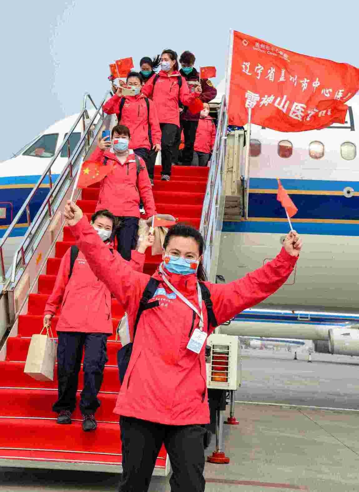 馳援武漢雷神山醫院的遼寧醫療隊走下飛機(南航 供圖)