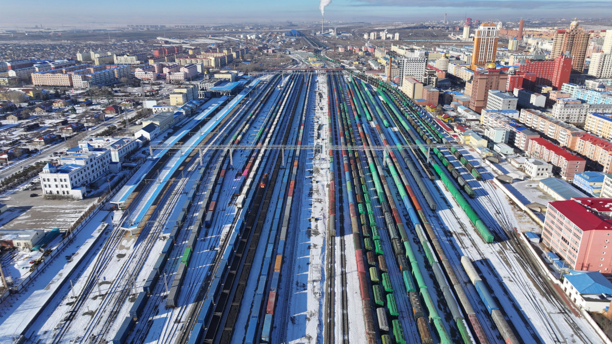11月27日,中歐班列在中國鐵路哈爾濱局集團有限公司滿洲裏站內整裝待發(無人機照片)。記者從中國鐵路哈爾濱局集團有限公司了解到,截至11月27日,作為中歐班列“東通道”的重要組成部分,滿洲裏鐵路口岸今年貨物過貨量突破2000萬噸,同比增長0.3%,創歷史新高。