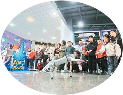 在浙江省嘉興市科技館,小朋友在“新質生産力·未來新引擎”科普主題展上與人形機器人和機器狗互動。