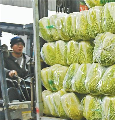 山東省煙臺市芝罘區西牟果蔬批發市場,經營戶在裝運大白菜。