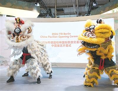 演員在2026柏林國際旅遊交易會中國展區表演舞獅。新華社記者 張豪夫攝