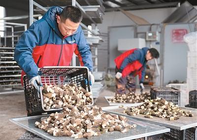 3月15日,在位於湖北省宜昌市遠安縣舊縣鎮的一家農業公司,工作人員攤鋪新鮮羊肚菌。新華社記者 伍志尊攝