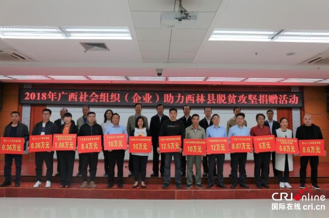 國際在線廣西頻道消息:近日,廣西民政廳在百色市西林縣舉行2018年廣西社會組織(企業)助力西林縣脫貧攻堅捐贈活動。活動中,西林縣共獲贈112萬元善款。