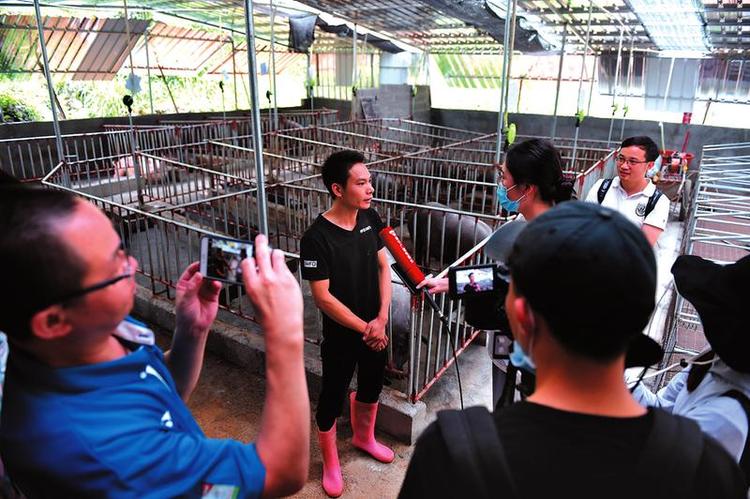 媒體一行集中採訪馬山雅聯村龍合養殖專業合作社貧困戶藍冠尤 本報記者潘浩 攝