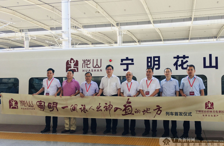 7月15日上午,“寧明花山號”冠名列車首發儀式在南寧東站舉行。在成功申遺4年後的今天,世界文化遺産“花山岩畫”隨著開動的列車,品牌沿高鐵線路延伸到珠三角乃至全國,將進一步擴大寧明的知名度、美譽度和競爭力。