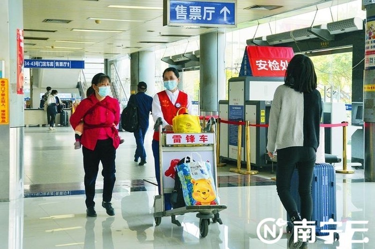 ▲在埌東汽車站,工作人員用雷鋒車為旅客運送行李,用週到的服務溫暖旅客。記者黃維業攝