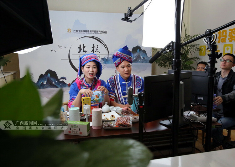在那馬服務區“黨團志願服務台”,工作人員通過直播帶貨為當地扶貧農産品開闢線上銷路。廣西新聞網記者 陶媛 攝